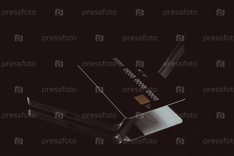 Кредитная карта на мобильном телефоне крупным планом на монохроматическом фоне, снятая с небольшой глубиной резкости
