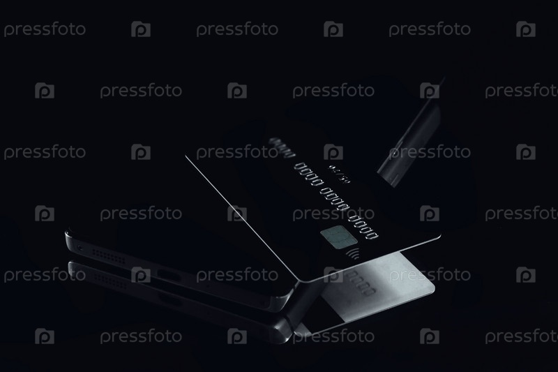 Кредитная карта на мобильном телефоне крупным планом на монохромном фоне, снятая с небольшой глубиной резкости