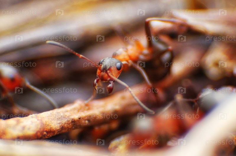 Красные муравьи крупным планом на естественном фоне