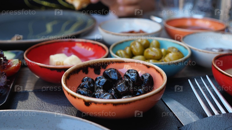На столе красочные миски с оливками и другой едой. Крупный план. Традиционный турецкий завтрак. Завтра в кафе