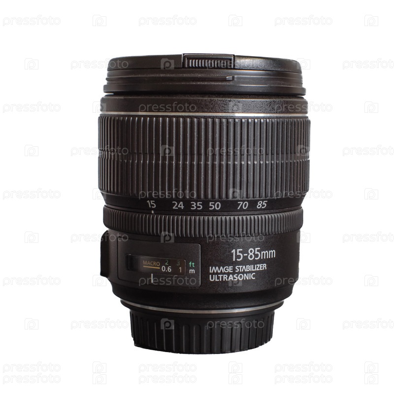 Объектив 1585 мм f35,6 мм для крепления EF-S. Крупный план. Отдельный на белом фоне