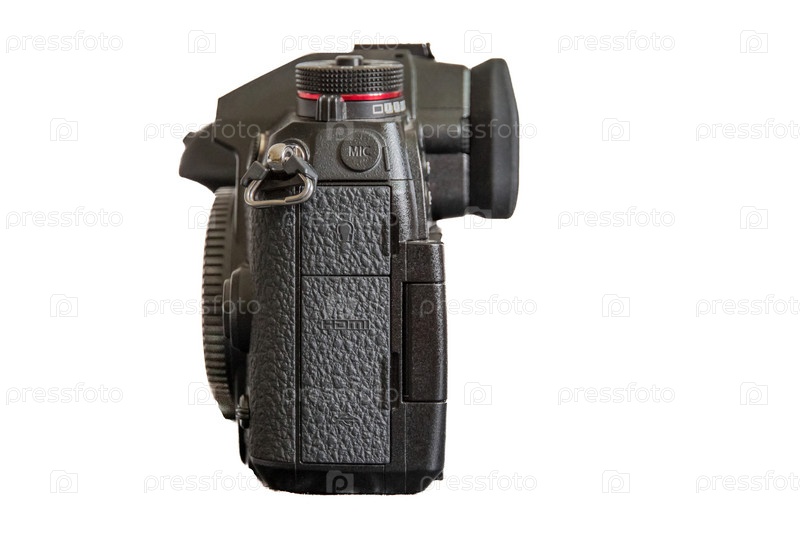 Японская профессиональная беззеркальная цифровая камера формата Micro Four Thirds. Вид со стороны. Изолированные на белом фоне