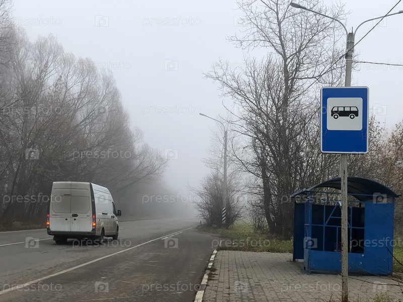 Пустая автобусная остановка на обочине асфальтированной дороги туманным осенним утром