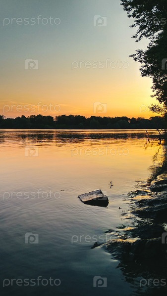 Яркий красочный закат над рекой. На переднем плане из воды в реке торчит камень. Оранжевый летний закат. Красота природы