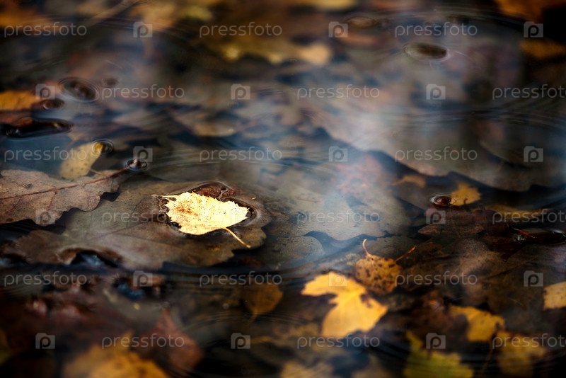 В луже плавают опавшие листья березы. Осенний фон