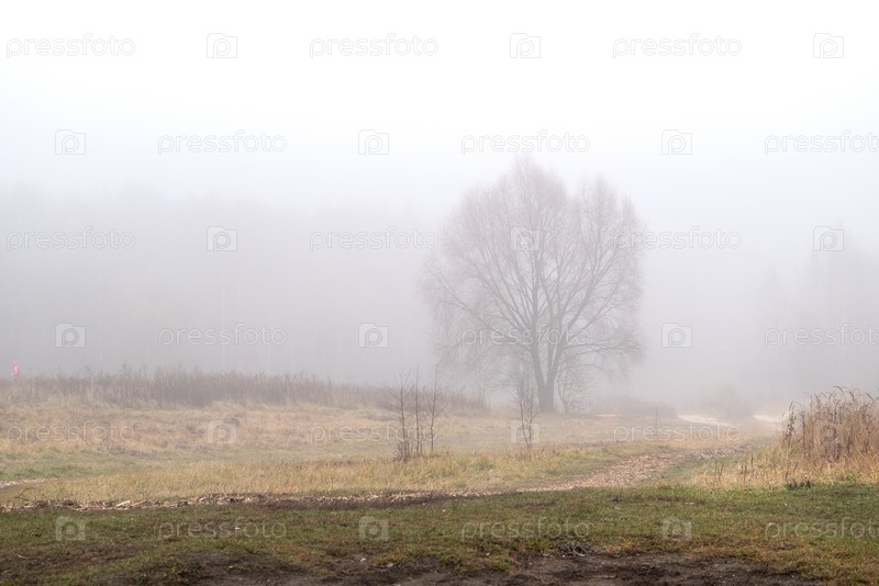 Большие силуэты деревьев в осеннем поле в густом тумане