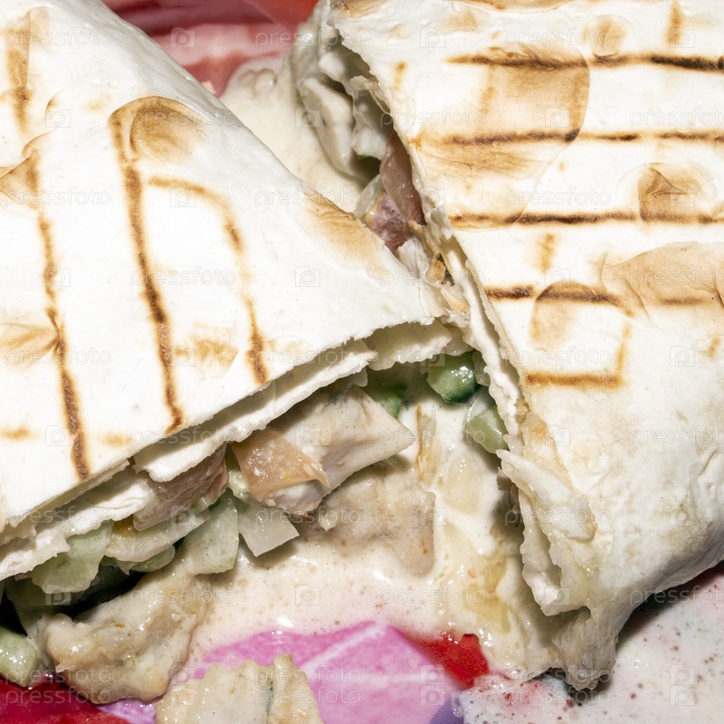 Шаурма в лаваше с курицей и овощами.Шаверма фон.Шаурма в лаваше с курицей и овощами