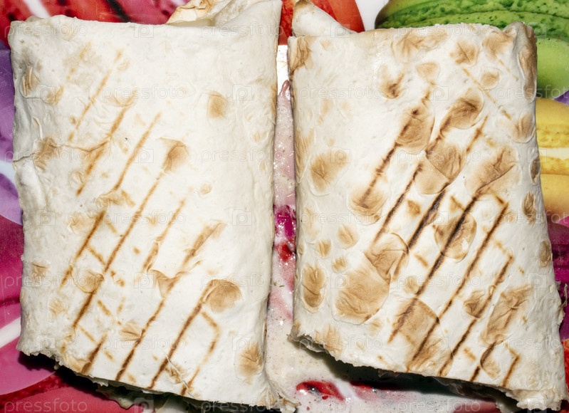 Шаурма в лаваше с курицей и овощами.Шаверма фон.Шаурма в лаваше с курицей и овощами