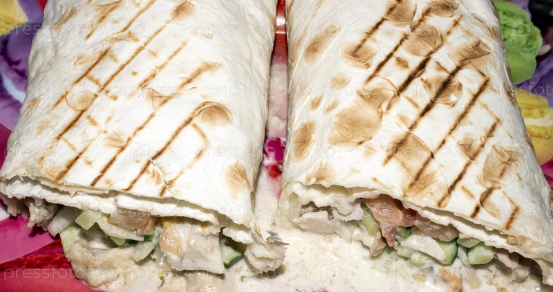 Шаурма в лаваше с курицей и овощами.Шаверма фон.Шаурма в лаваше с курицей и овощами