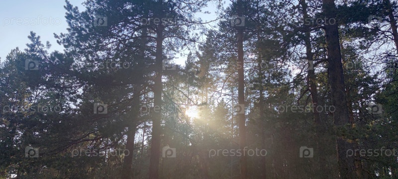 Длинные стволы сосен и елей в лесу
