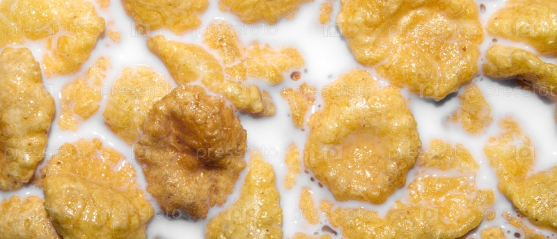 Хлопья кукурузные на молоке.Готовый завтрак из кукурузных хлопьев с молоком.Фон из кукурузных хлопьев в молоке.Золотистые кукурузные хлопья с молоком