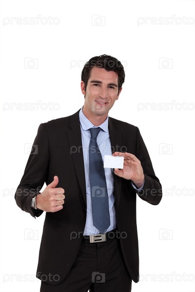 Молодой бизнесмен с визитной карточкой и большим пальцем