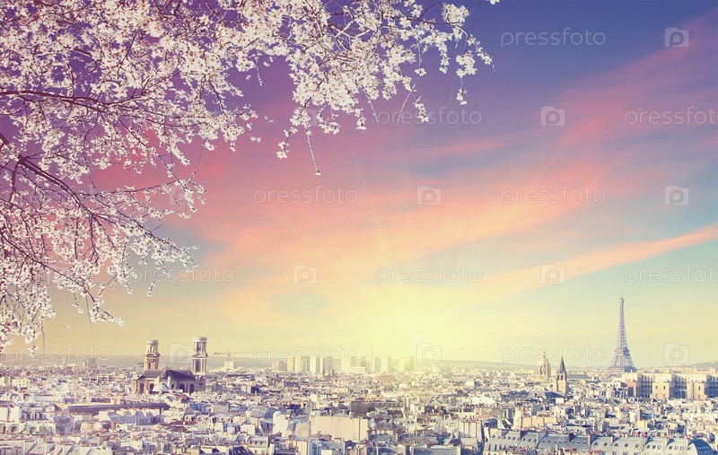 Вид с воздуха на городской пейзаж Парижа с Эйфелевой башней с рамкой из цветущих деревьев на закате. Винтажная цветная картинка. Концепция бизнеса, любви и путешествий