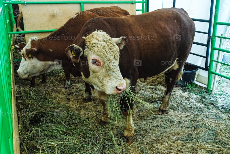 Тюмень, Россия - 24 июня 2016 г.: 5-й открытый чемпионат России по пашне. Коровы мясной породы Обрак. В 2002 году коровы были завезены в Тюменскую область, где показали высокие адаптационные качества