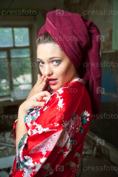 Красивая молодая женщина в полотенце и халате на фоне комнаты