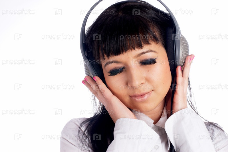 Молодая женщина в наушниках слушает громкую музыку на изолированном фоне