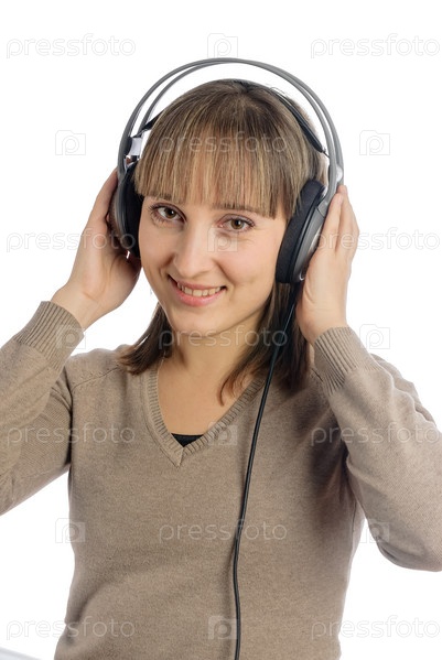 Портрет счастливой девушки с наушниками. Изолированные на белом фоне