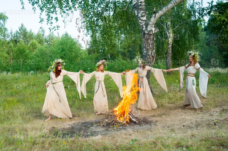 Четыре привлекательные женщины с венком из цветов танцуют вокруг костра. Празднование Ивана Купалы. Россия