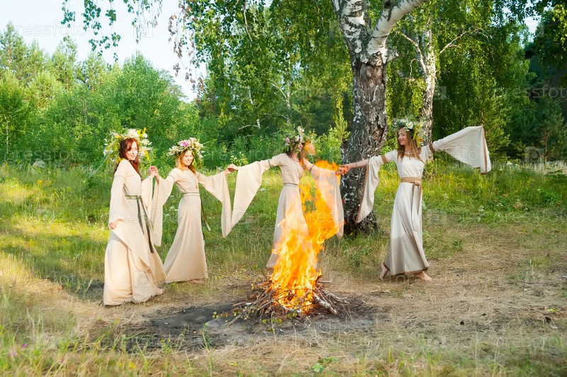 Четыре привлекательные женщины с венком из цветов танцуют вокруг костра. Празднование Ивана Купалы. Россия