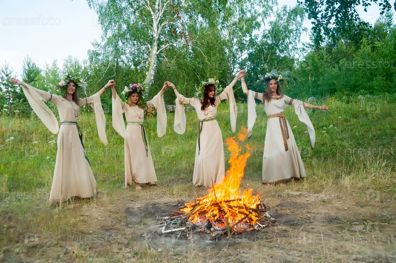 Привлекательные женщины с венком из цветов танцуют вокруг костра. Празднование Ивана Купалы. Россия