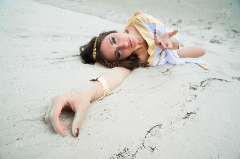 Привлекательная девушка в греческой тунике слепо лежит на песке