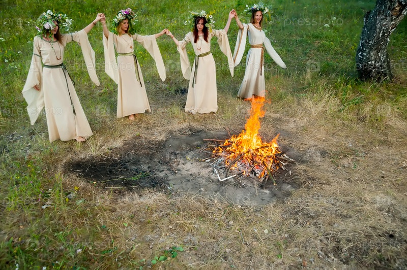 Четыре привлекательные женщины с венком из цветов танцуют вокруг костра. Празднование Ивана Купалы. Россия