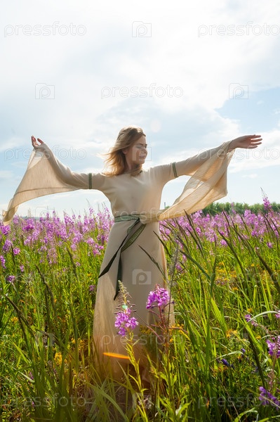 Красивая женщина в традиционной одежде отдыхает на кипрейном лугу