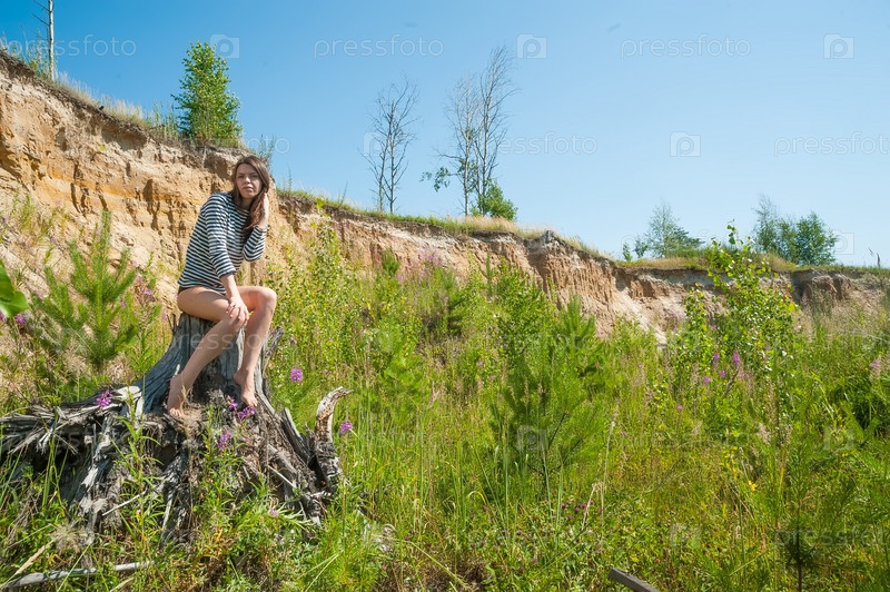 Портрет молодой привлекательной брюнетки, сидящей на пне
