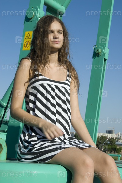 Молодая красивая женщина сидит на большом строительном кране у реки