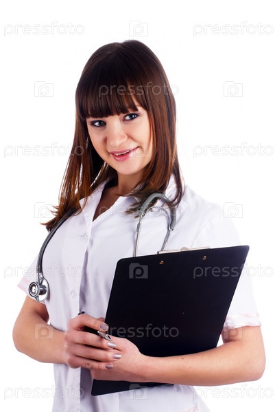 Портрет молодой привлекательной женщины-врача со стетоскопом на белом фоне