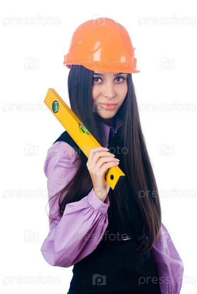 Привлекательная девушка в шлеме с инструментом уровня поверх белого