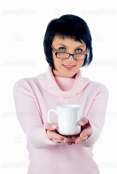 Молодая красивая улыбающаяся женщина с чашкой над белым