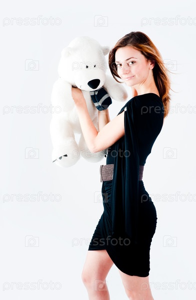 Молодая красивая женщина с белым медведем над белым