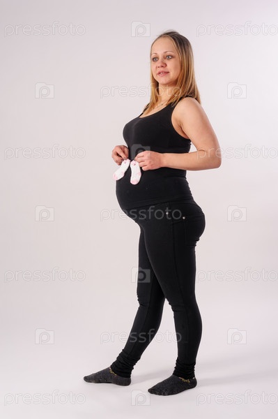 Студийный портрет красивой молодой беременной женщины с детскими носками на белом фоне