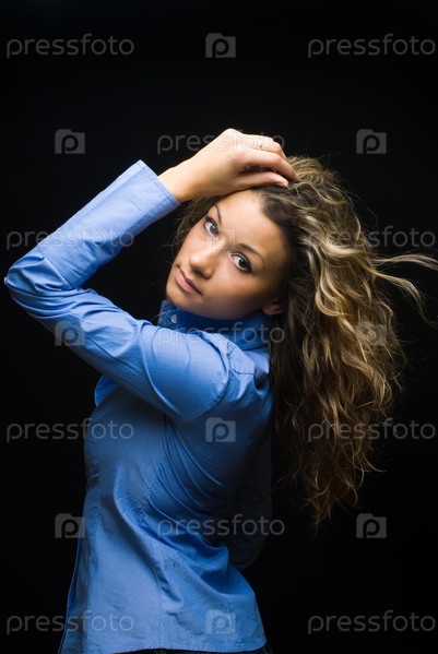 Портрет красивой кудрявой женщины в джинсовой рубашке