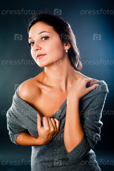 Молодая красивая женщина в свитере на черном фоне