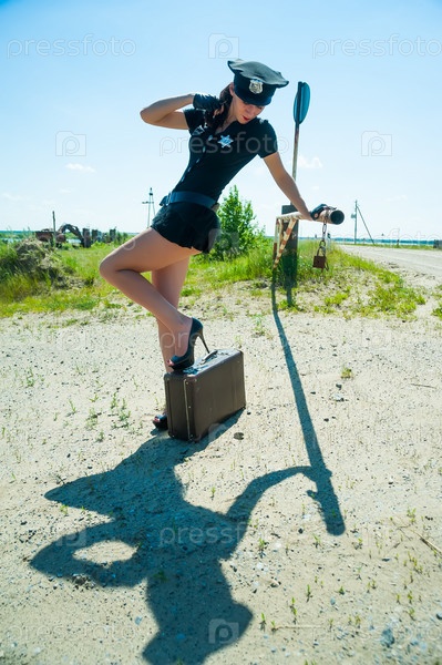 Сексуальная женщина-полицейский с чемоданом