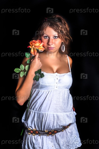 Привлекательная молодая рыжеволосая женщина с цветком на черном фоне