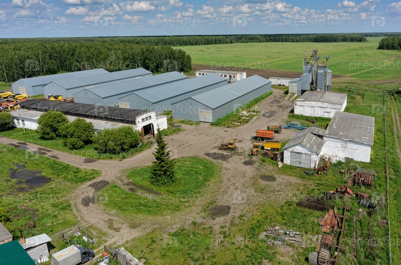 Верховина, Россия - 14 июня 2017 г.: Вид с воздуха на современный машинный двор сельскохозяйственной фирмы. Свердловская область