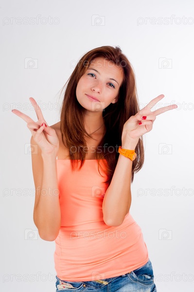 Молодая красивая женщина с веснушками показывает победный жест и смотрит в сторону на белом фоне