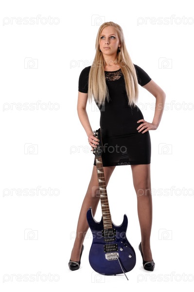 Сексуальная женщина с гитарой, изолированная на белом фоне