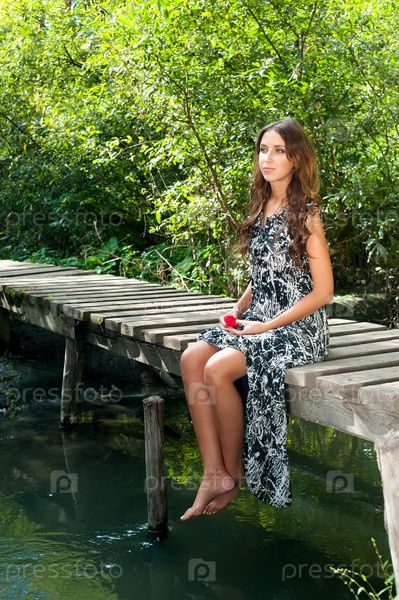 Привлекательная молодая женщина сидит на деревянном мосту на открытом воздухе