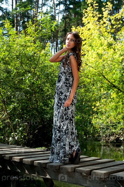 Привлекательная молодая женщина стоит на деревянном мосту на открытом воздухе