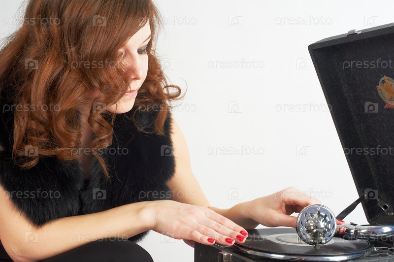 Молодая красивая женщина отдыхает у граммофона, слушая музыку