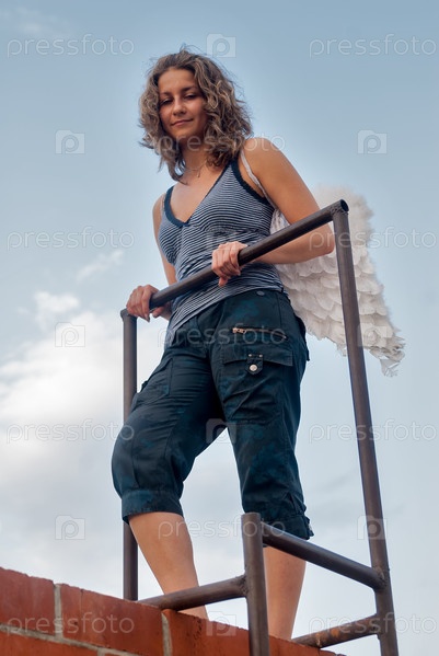 Привлекательная женщина с крыльями ангела на крыше