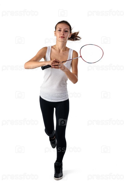 Симпатичная женщина держит ракетку для бадминтона и прыгает. Изолированные на белом фоне