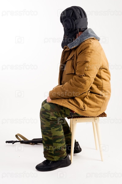 На табуретке сидит офицер-танкист с автоматом АКМ. Изолированные на белом фоне