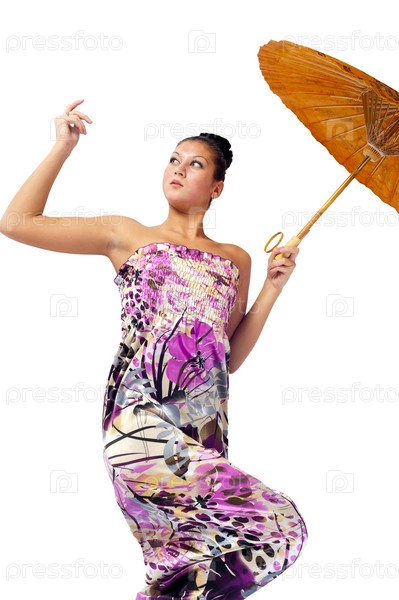 Молодая красивая женщина с азиатским зонтиком. Изолированные на белом фоне