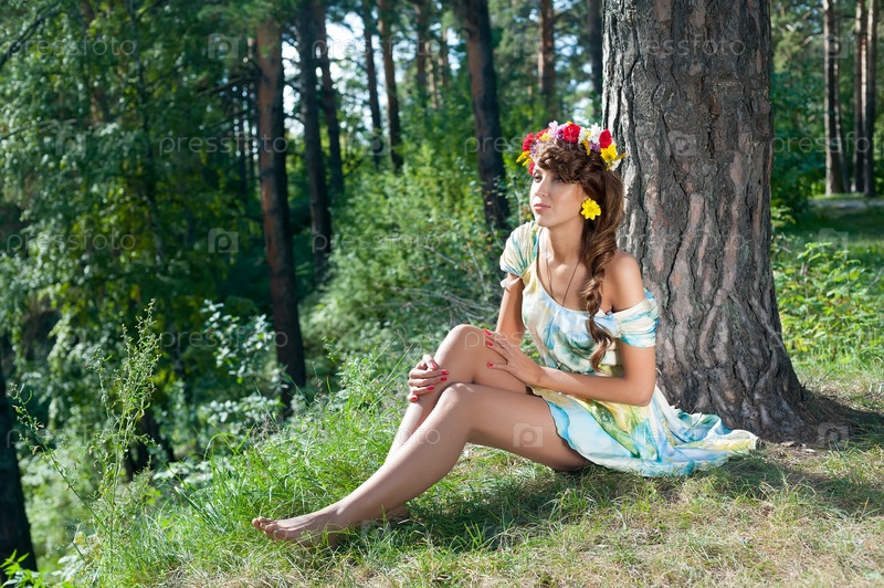Привлекательный женский портрет с венком из цветов сидит возле сосны. Естественная красота