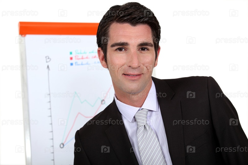 Бизнесмен стоит рядом с флип-чартом
